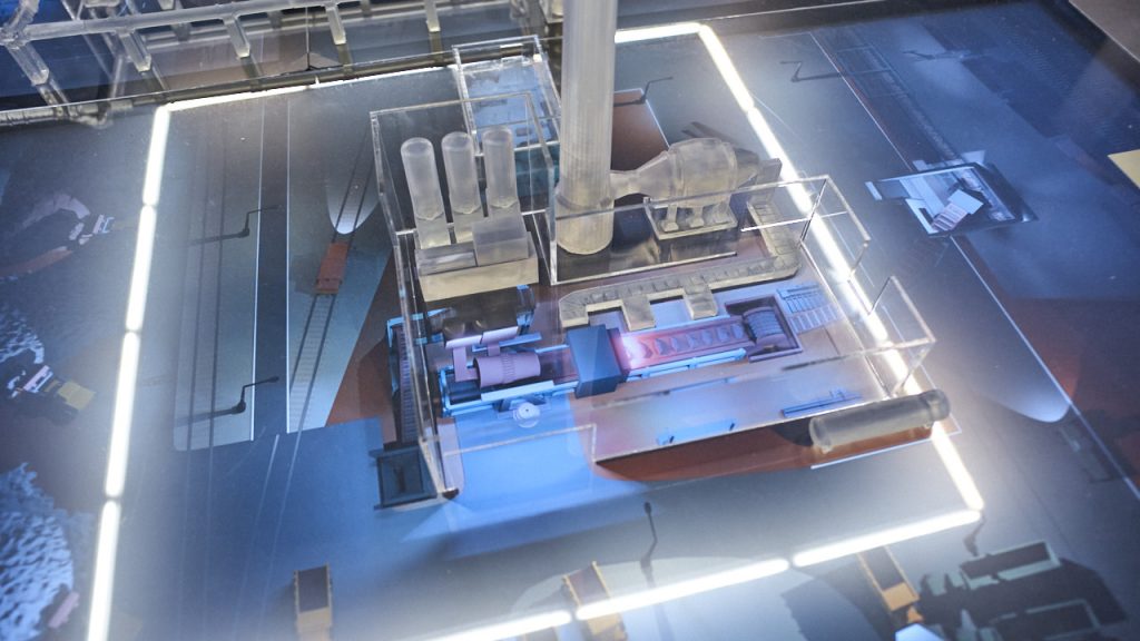 Das gelingt mit einem digitalen Hüttenmodell, das sich über einen großen Bildschirm zieht. Ein Klick, ein Handgriff – und schon leuchten Transportwege, Rohstoffflüsse und Feuerzungen auf, begleitet von Erklärungen in mehreren Sprachen.