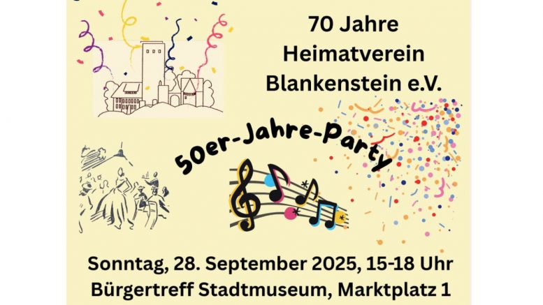 Hattingen – Feier mit Musik, Tanz und 50er-Jahre-Flair. Der Heimatverein Blankenstein e.V. feiert in diesem Jahr ein besonderes Jubiläum: Seit 70 Jahren engagieren sich Mitglieder für Geschichte, Brauchtum und Gemeinschaft im Stadtteil. Gefeiert wird am Sonntag, 28. September 2025, von 15 bis 18 Uhr im Bürgertreff des Stadtmuseums (Marktplatz 1).