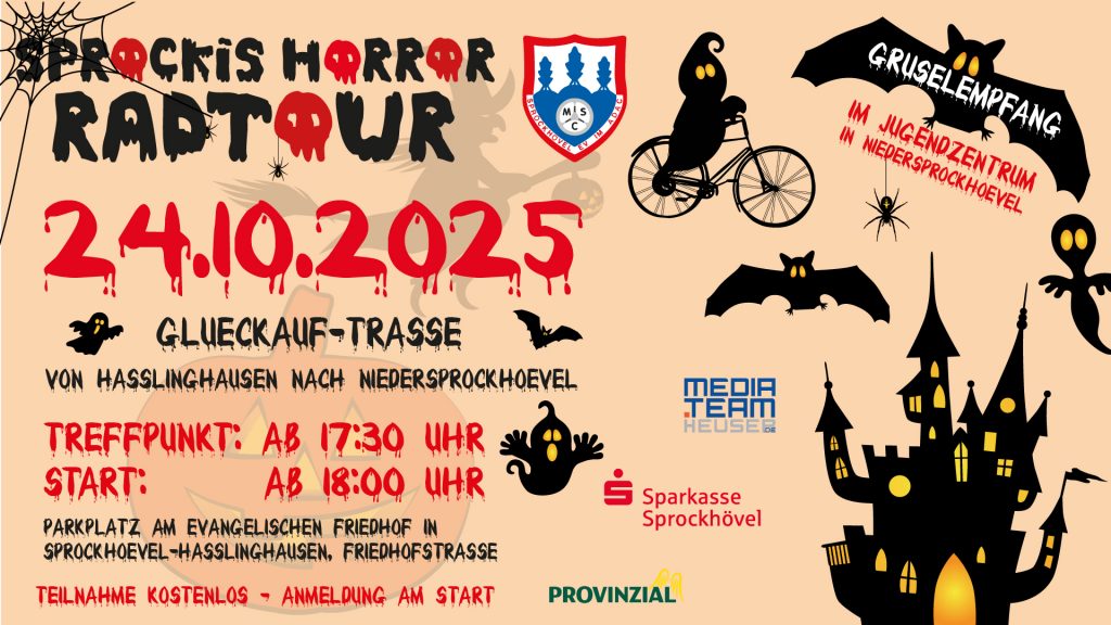 Am morgigen Freitag (24. Oktober 2025) haben nämlich der Motorsportclub Sprockhövel MSC und das Media-Team Heuser wieder zur „Sprockis Horror Radtour“ von Haßlinghausen nach Niedersprockhövel eingeladen. Wettermäßig soll es zumindest trocken bleiben.