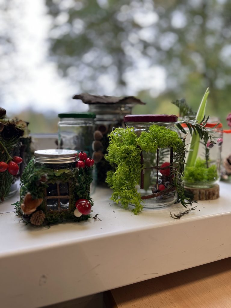 Die Klasse 7c sammelte bei der Walderkundung Naturmaterialien und bastelte daraus im Anschluss kleine Wichtelhäuschen, Kastanienmännchen und herbstliche Deko.