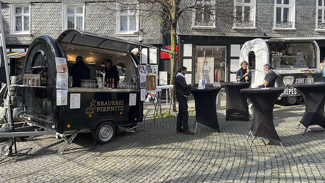 Im Krämersdorf sorgen gleich drei große Foodtrucks für ein breites kulinarisches Angebot, das vom Klassiker bis zu trendigen Streetfood-Gerichten reicht. Auf dem Obermarkt hingegen geben sich zwei deutlich kleinere Foodtrucks die Ehre – eher Mini-Mobile im Format eines Fiat 500 als wuchtige Trucks, dafür aber ausgesprochen charmant gestaltet. Daneben betreibt ein großer Grillstand sein Geschäft – ein Hingucker, der zwar etwas dominant wirkt, das Gesamtbild aber nicht stört.