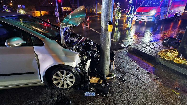 Der Pkw überfuhr die dortige Verkehrsinsel und prallte gegen den dort stehenden Ampelmasten. Ein hinter dem Ampelmasten stehender Fußgänger, der auf „Grün“ wartete um die Straße zu überqueren, wurde dabei von dem Pkw angefahren und lebensgefährlich verletzt. Auch der Autofahrer sowie seine Beifahrerin erlitten bei diesem Unfallgeschehen Verletzungen.