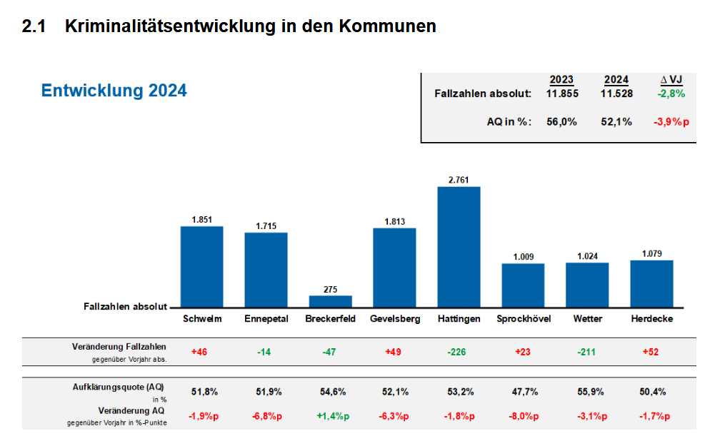 Polizeiliche Kriminalstatistik 2024 – Fallzahlen pro Kommune. (Quelle: Polizei-EN, Foto: Höffken)