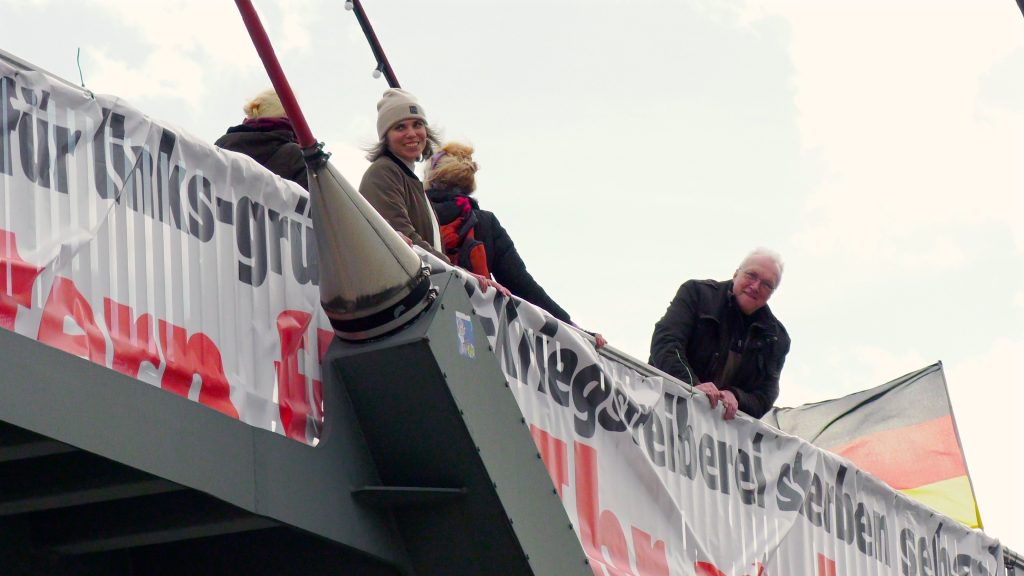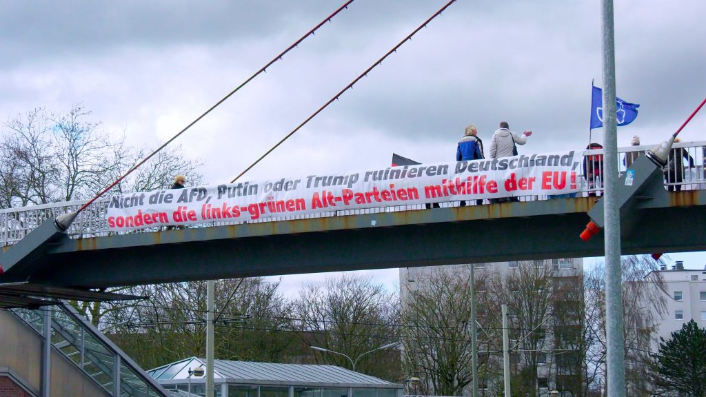 Hattingen – Über der vielbefahrenen B51, direkt an der Fußgängerbrücke zum Busbahnhof, wehten am Samstagvormittag (28. Februar 2026) plötzlich große Banner im Wind. Aufgehängt wurden sie von Akteuren der sogenannten „Montagstrommler“, die damit erneut auf sich aufmerksam machen wollen.