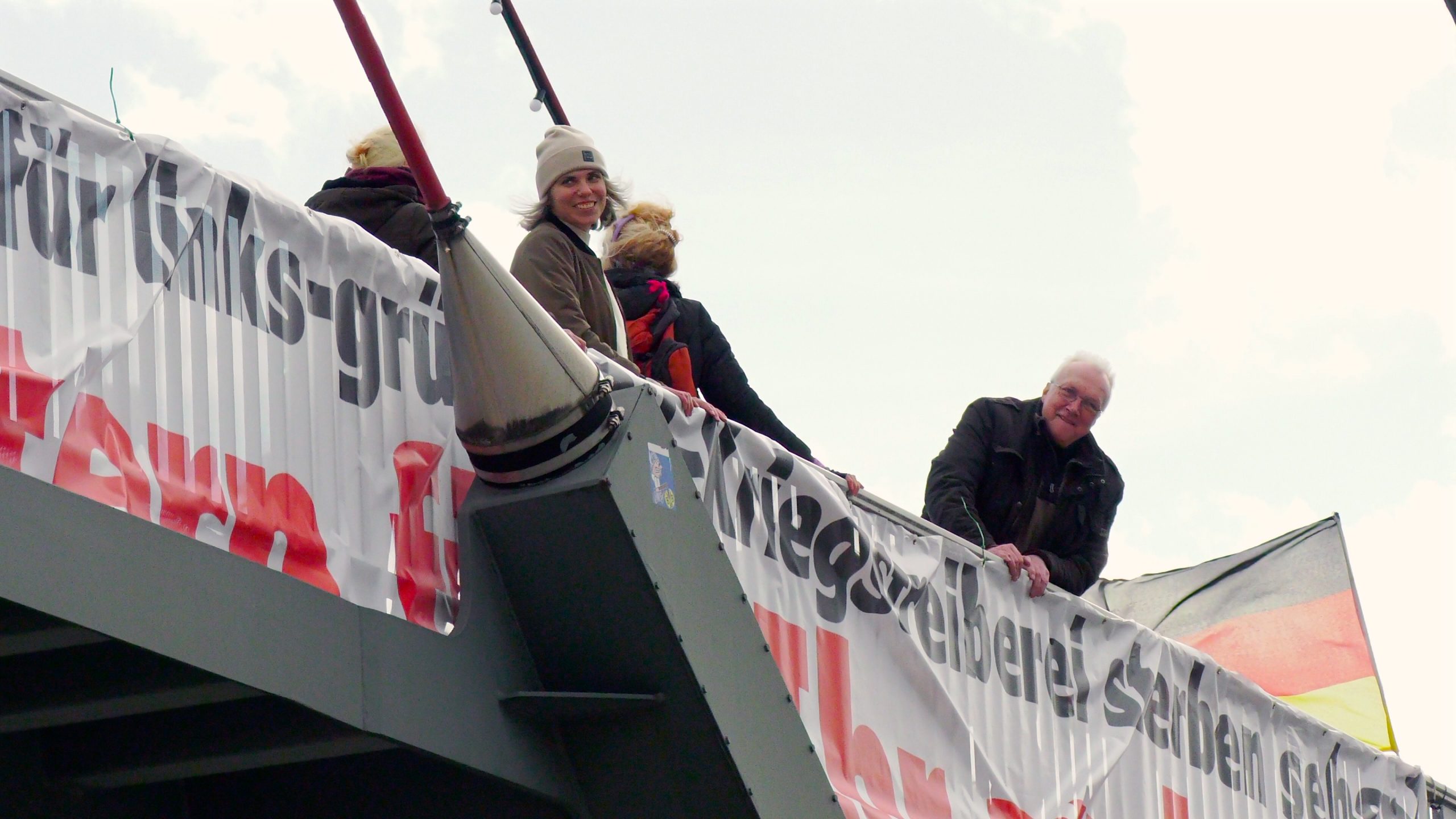 Während oben auf der Brücke die Banner befestigt wurden, herrschte auf der Straße darunter kurze Aufregung. Einige Autofahrerinnen und Autofahrer reagierten mit lautem Hupen – ob zur Zustimmung oder zum Protest, ließ sich schwer sagen. Die Aktivisten winkten jedenfalls fröhlich mit ihren Fahnen zurück.