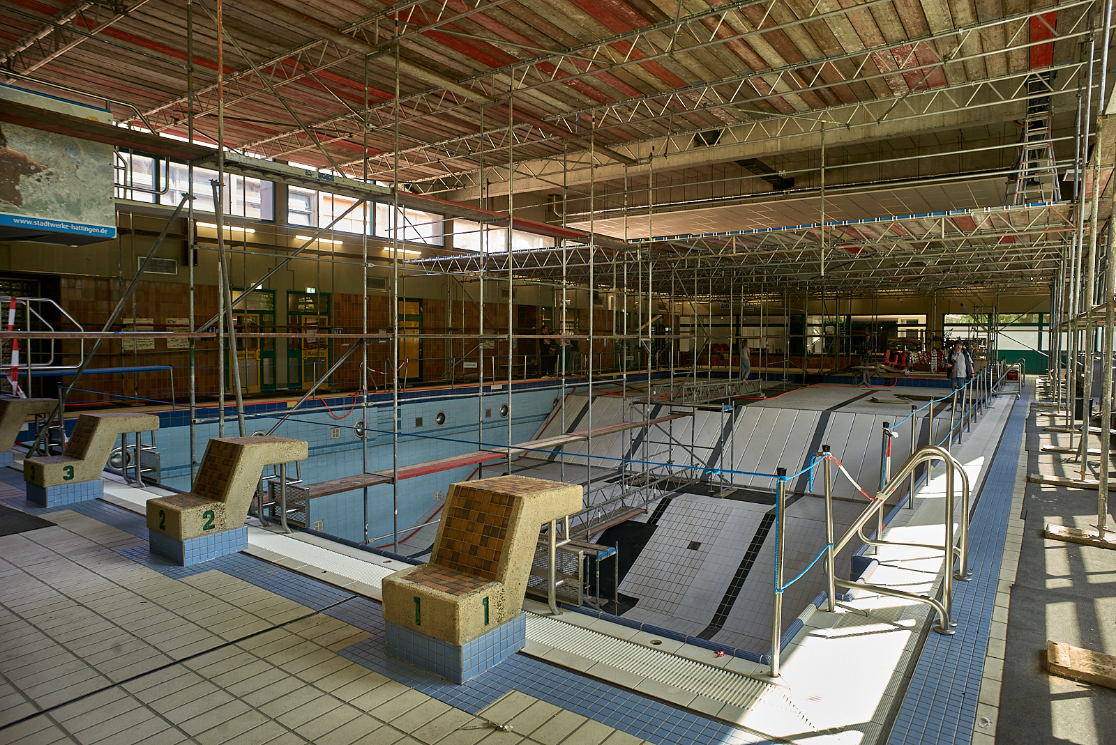 Bei einer Grundreinigung Anfang des Jahres stellte sich heraus, dass die abgehängte Zwischendecke über dem Schwimmbecken nicht mehr sicher war. Die Halterungen waren stark korrodiert, einzelne Lamellen bereits locker – ein vollständiges Herabstürzen war nur eine Frage der Zeit. Ein Gerüst musste aufgestellt werden, die Decke wurde komplett entfernt.