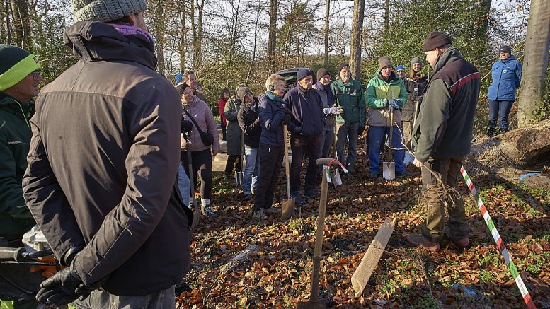 Spätestens auf den teilweise vereisten Waldwegen hinauf zur Pflanzfläche zeigte sich: Es gibt kein schlechtes Wetter, nur die falsche Kleidung. Dick eingepackt, aber gut gelaunt, machten sich die Helferinnen und Helfer auf den Weg zu der Fläche, die an diesem Vormittag ein Stück klimafester werden sollte.