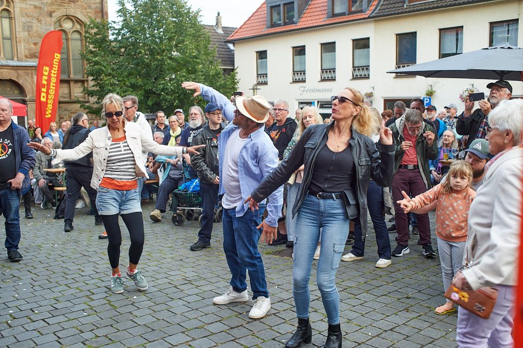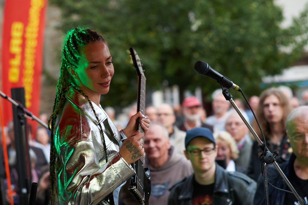 Danach übernahmen Hot’N’Nasty die Bühne. Ihre Mischung aus Blues und Rock brachte ordentlich Druck in den Marktplatz – ganz im Sinne ihres Mottos „Powerblues“. Das Publikum rückte langsam dichter an die Bühne, und spätestens bei der Zugabe mit „La Grange“ von ZZ Top hielt es niemanden mehr still: Tanzende Füße und wippende Köpfe bestimmten das Bild.