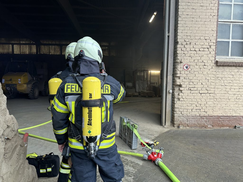 Vor Ort brannten in einer Halle mehrere Paletten mit Material aus Pappe. Betriebsangehörige hatten Teile der brennenden Paletten bereits mit einem Gabelstapler ins Freie befördert und so dazu beigetragen, einen Großbrand zu verhindern.