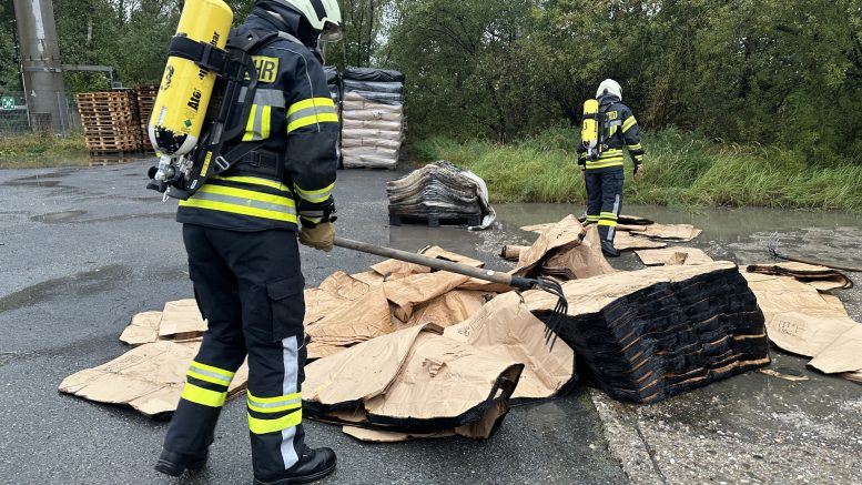 Die Feuerwehr setzte zwei Trupps unter schwerem Atemschutz zur Brandbekämpfung innerhalb der Lagerhalle ein. Anschließend wurden Teile der Hallenwand gekühlt und der Bereich mit einer Wärmebildkamera kontrolliert.