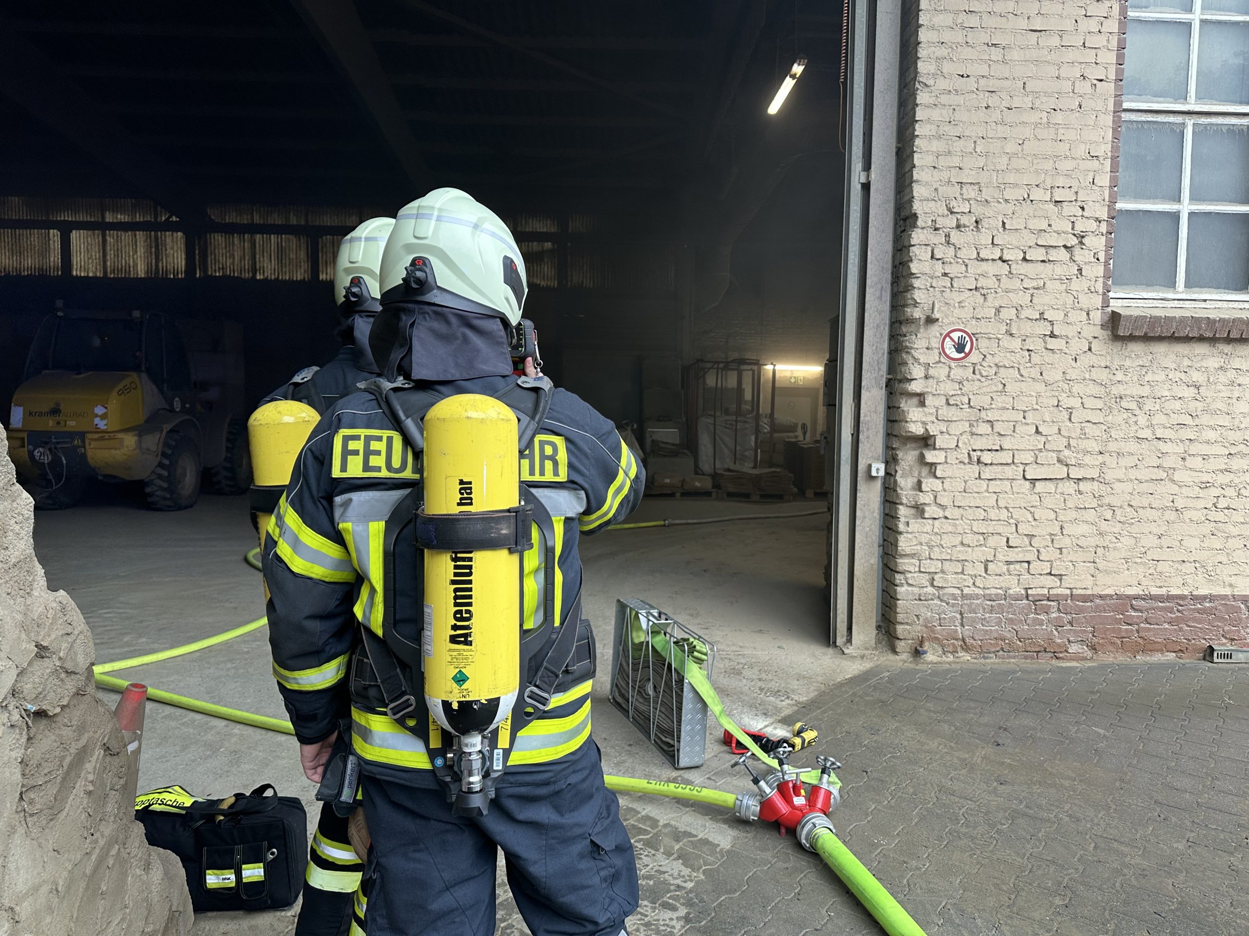Die Feuerwehr setzte zwei Trupps unter schwerem Atemschutz zur Brandbekämpfung innerhalb der Lagerhalle ein. Anschließend wurden Teile der Hallenwand gekühlt und der Bereich mit einer Wärmebildkamera kontrolliert.