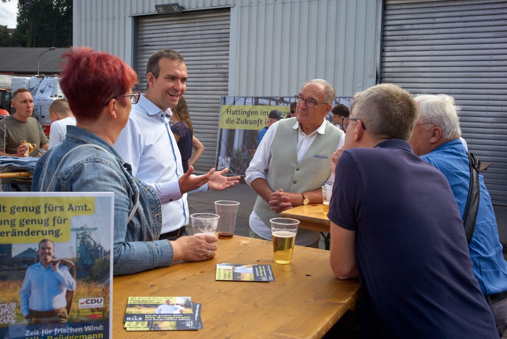 Hattingen – Nils Brüggemann, parteiloser Bürgermeisterkandidat für Hattingen, hat am Freitag dem 29. August 2025 unter dem Motto: „Bratwurst. Bier. Brüggemann.“ eingeladen – und mehr als 150 Gäste kamen. Unterstützer, Neugierige, Engagierte aus Vereinen, Politik und Nachbarschaft – von den „alten Hasen“ über Bundestagsabgeordnete bis zu jungen Erstwählern. Mitglieder von CDU und FDP, die Brüggemann im Wahlkampf unterstützen, waren ebenfalls vertreten.
