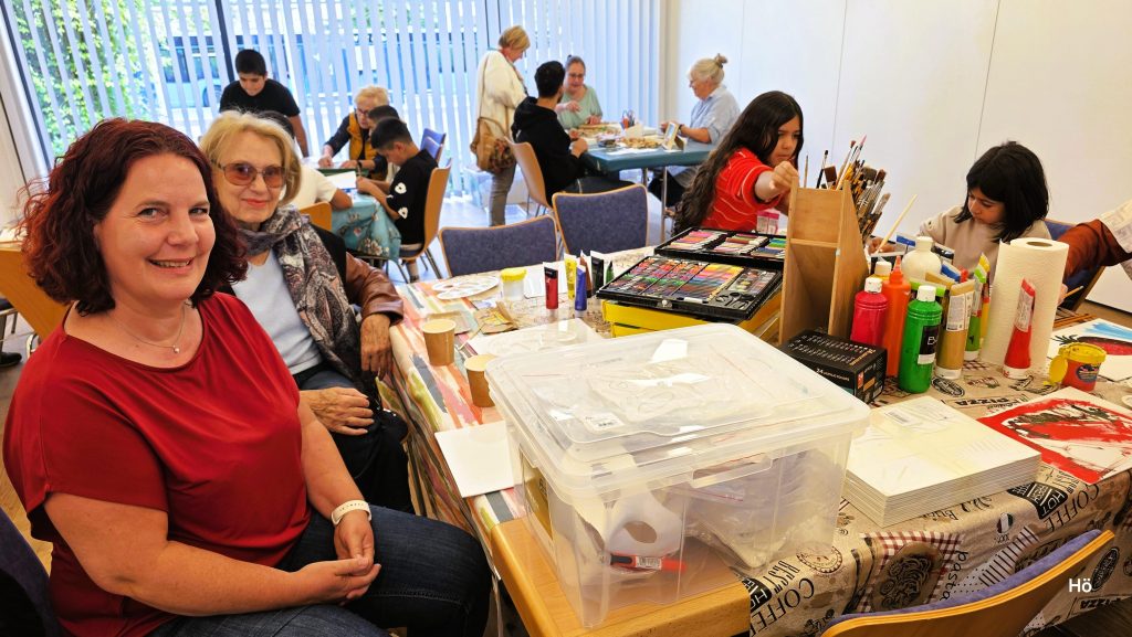 Flüchtlingshilfe Sprockhövel – Auch bei diesem Jubiläums-Sommerfest gab es ein umfangreiches Bastelangebot für Kinder, hier Birgit Schniedermeier, SPD-Bürgermeisterkandidation (li,), an einem der Tische. (Foto: Höffken)