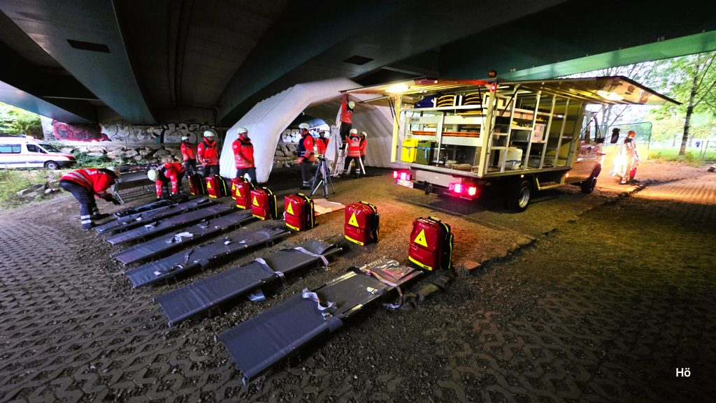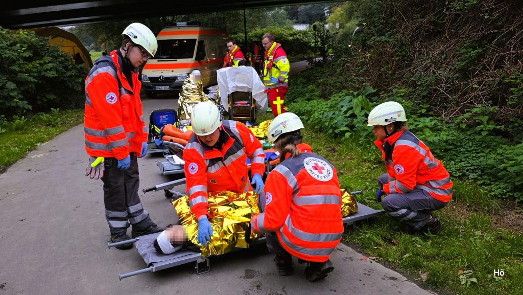 Hattingen – Sie kamen am heutigen späten Freitagnachmittag ( 10. Oktober 2025) ohne Sondersignal, dennoch wurden sofort viele Radfahrende, Spaziergänger und junge Leute im Bereich der Ruhrbrücke aufmerksam. Rund 50 ehrenamtliche Frauen und Männer einer Einsatzeinheit des DRK Bochum mit Einsatzfahrzeugen NEF und RTW des Regelrettungsdienstes in Kooperation mit dem Jugendrotkreuz als Notfalldarsteller trafen an der Ruhr ein. Dazu kamen die ehrenamtlichen Kräfte der DLRG Hattingen-Süd und Hattingen-Blankenstein. Modernste Technik kam vom DLRG Hattingen zum Einsatz, mittels Drohnen-Luftraumbeobachtung blieb kein Verletzter unentdeckt.