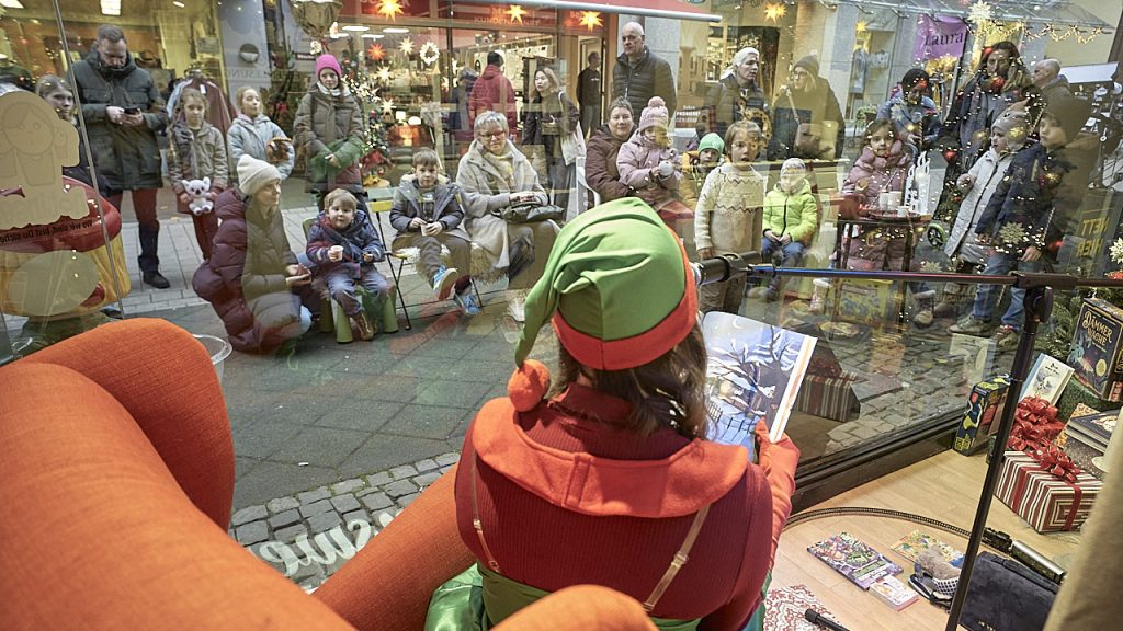 Was wie eine kleine Idee klingt, wirkte draußen auf der Straße erstaunlich groß. Eine Lautsprecherbox, eine Verstärkeranlage, sogar ein Mischpult: Technik, die sonst eher nach Konzert aussieht, sorgte dafür, dass jedes Wort der Elfe nach draußen getragen wurde. Und plötzlich war da diese besondere Stille, die man nur kennt, wenn Kinder wirklich zuhören. Als hätten sich die Ohren ein kleines Stück vergrößert und direkt zum Schaufenster ausgerichtet – damit ja kein Satz verloren geht.