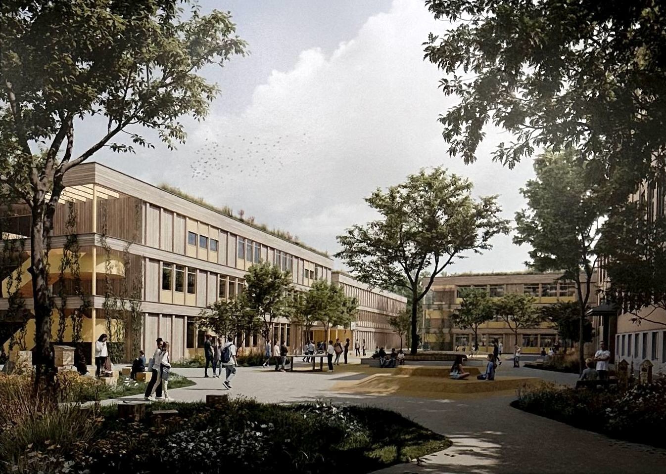 Pädagogisch folgt das Konzept dem Leitbild einer Campus- und Clusterschule: Im Bestandsgebäude werden naturwissenschaftliche Fachräume gebündelt und um Klassenräume ergänzt, während der Neubau moderne Lerncluster mit zusätzlichen Gruppenräumen bietet. Der verbindende Schulhof bildet künftig das Herz des Campus und schafft vielfältige Aufenthalts- und Bewegungsangebote. Positiv bewertet wurde von der Jury zudem, dass durch die Bauabfolge keine aufwändigen Containerlösungen während der Bauzeit erforderlich sind