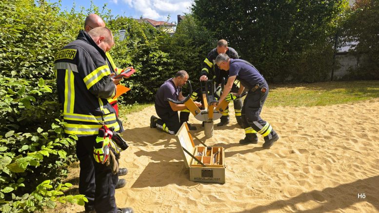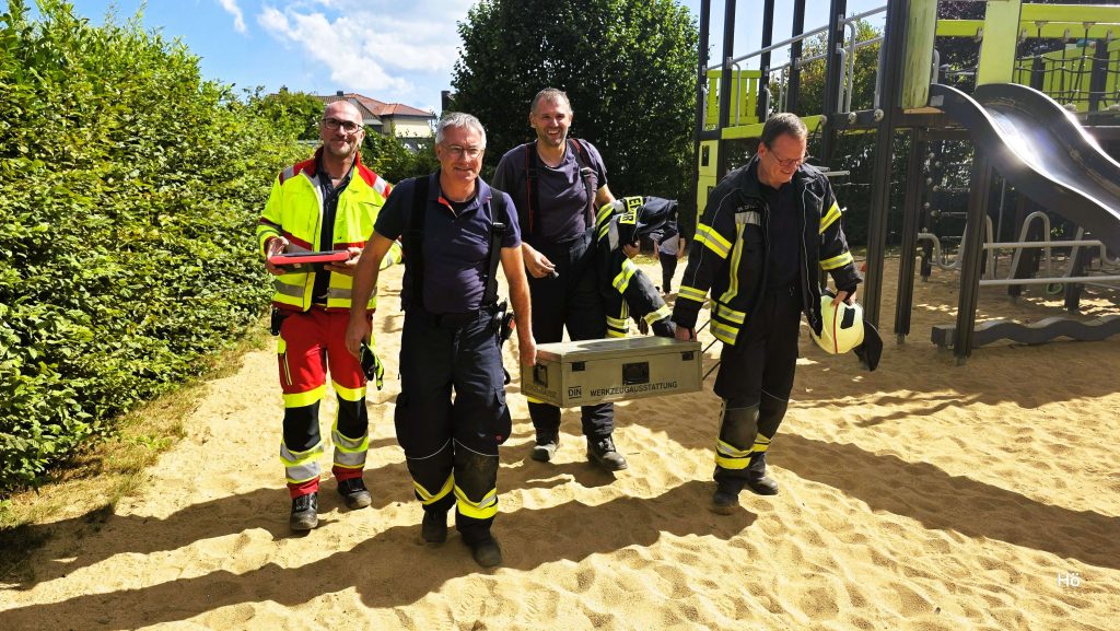 Eine für städtische Spielplätze zuständige Mitarbeiterin der Verwaltung traf dann ebenfalls ein, machte sich ein Bild von der aktuellen Situation und sorgt zeitnah für die Reparatur der von den Kräften der Feuerwehr abgetrennten Fußstütze.