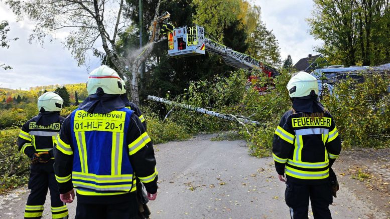 Sprockhövel – Der Herbst ist da und nachdem im Laufe des heutigen Donnerstag Vormittag der intensive Regen aufhörte, wurden die Einsatzkräfte der Feuerwehr Sprockhövel am Mittag ( 23. Oktober 2025) bereits zum ersten Sturmeinsatz alarmiert. Auf der Kleinbeckstraße war ein Baum umgefallen und lag über der Fahrbahn. Routine für die Einsatzkräfte.