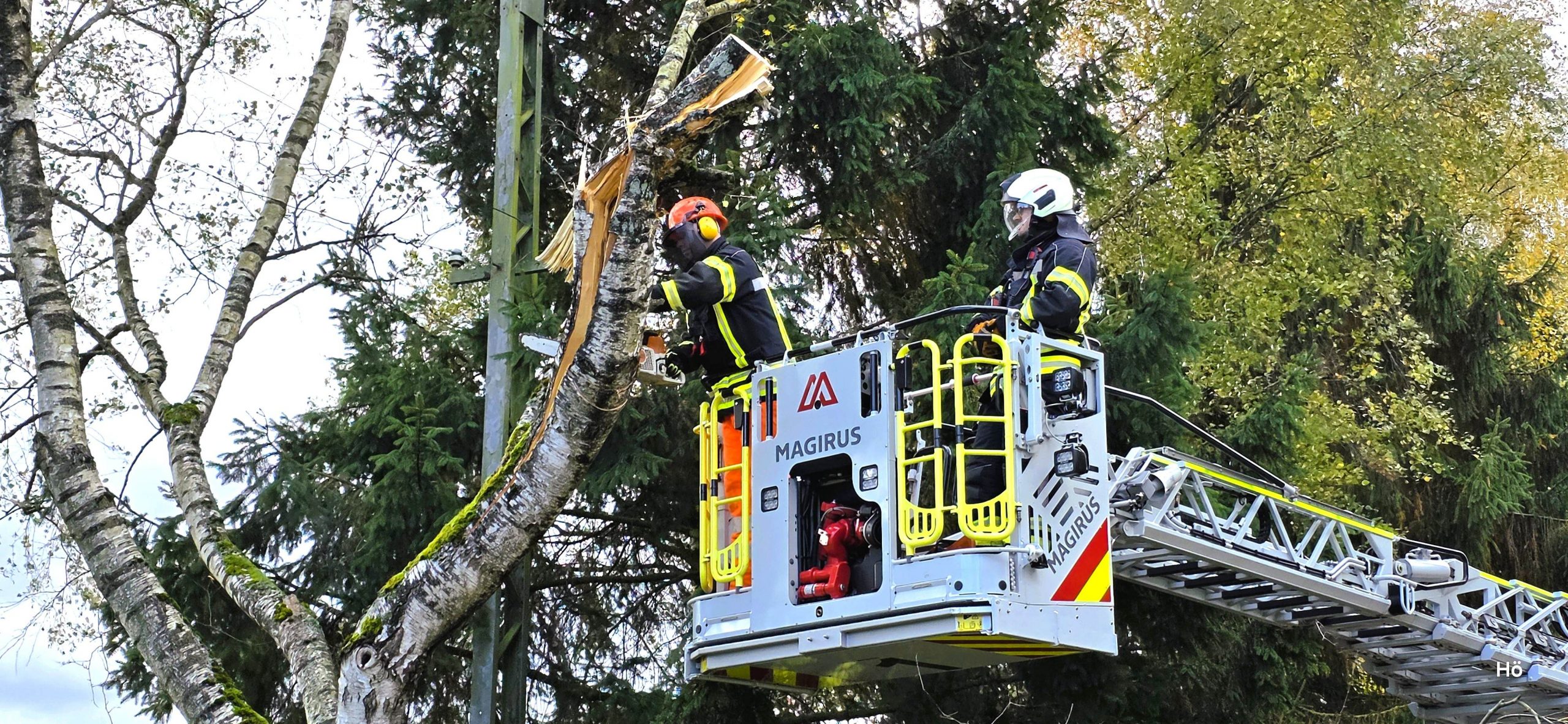 Der Rest lief professionell ab. Die Einsatzstelle wurde abgesichert, die Drehleiter in Stellung gebracht. Mittels Motorsägen wurde der über der Fahrbahn hängende Baum von dafür speziell ausgebildeten Einsatzkräften von der Drehleiter aus abgesägt. Der Stamm und die großen Äste wurde dann zerkleinert und im Randbereich gelagert. Von der Polizei wurde der Grundstückseigentümer über den Sachverhalt informiert.