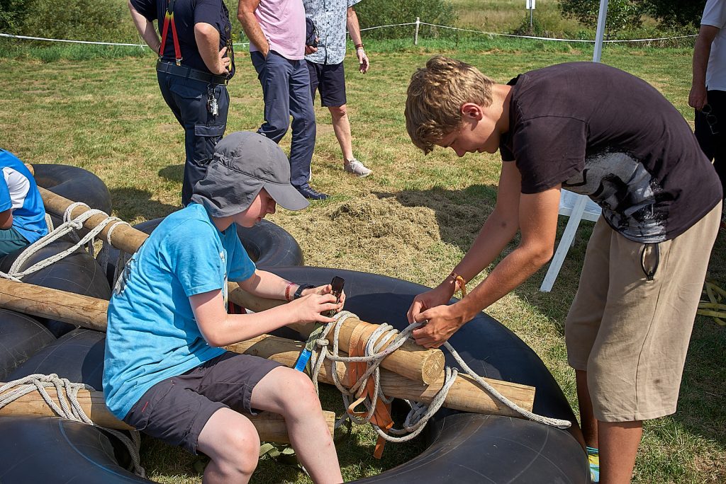 Tagsüber ging es ans Eingemachte: Floßbau. Drei Männer von der Freiwilligen Feuerwehr hatten den Hut auf – Handwerker, Teammanager, Coach und Respektsperson in einem. Anfangs drängten sich viele Kinder beim „coolsten“ Floß, während andere Gruppen nicht genug Helfer hatten. Doch Feuerwehrleute wissen, wie man aus Einzelkämpfern Teams macht. Am Ende arbeiteten sechs Gruppen mit vollem Einsatz.