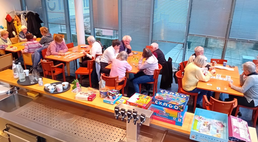 Neben Geselligkeit werden dabei auch unbemerkt strategisches Denken und Zusammenspiel gepflegt. Eine Tasse Kaffee, Plätzchen oder ein Glas Wasser werden gegen eine kleine Spende bereitgestellt.