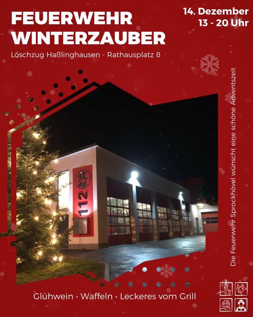 Wie bereits im Vorjahr lädt der Löschzug Haßlinghausen am kommenden Samstag von 13.00 Uhr bis 20.00 Uhr auch in diesem Jahr zum Winterzauber am Gerätehaus in Haßlinghausen ein.