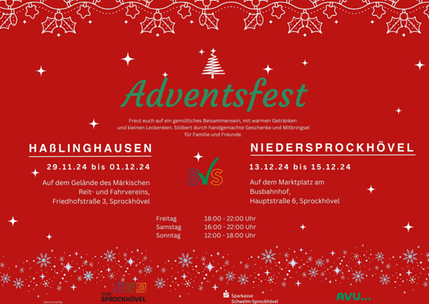 Nach dem gelungenen Auftakt am letzten Wochenende in Haßlinghausen wird das Adventsfest jetzt in Niedersprockhövel auf dem Marktplatz am Busbahnhof veranstaltet.