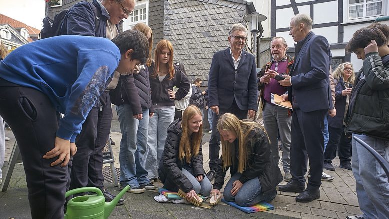 Hattingen – Am 5. November haben Schüler der Realschule Grünstraße die ersten Stolpersteine der diesjährigen Gedenkwoche gereinigt – Auftakt um 9:30 Uhr am Steinhagen beim Stein für Emmi Roth. Die Schule arbeitet seit Jahren an ihrer Geschichte: Von Emmi Roth war vor Ort kaum noch etwas bekannt; die Jugendlichen haben recherchiert, lebende Verwandte ausfindig gemacht, getroffen und Biografisches zusammengetragen. Treibende Kraft des Projekts: Judith Nockemann. Beteiligt waren die Klasse 8b (mit Karsten Heilinger), Klasse 10a (mit Jörg Maack), der Religionskurs Jahrgang 9 (mit Judith Nockemann), außerdem Ingo Rodowsky und Gisela Hülsmann mit ihren Inklusionsschülern. Dorothee Krengel begleitete die Aktion als Mitglied der Schulleitung. Die Initiative kam aus der Schülerschaft; Lehrkräfte unterstützten organisatorisch.