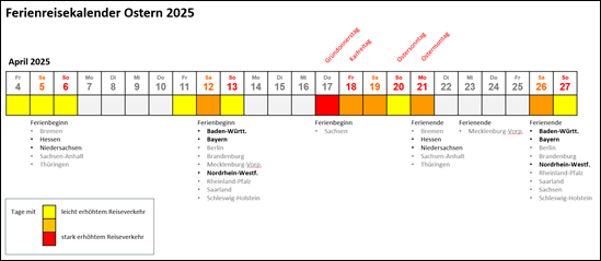 Daher besteht nachmittags vor allem in den Ballungsräumen ein erhöhtes Staurisiko. Am Ostermontag (21. April 2025) ist mit starkem Rückreiseverkehr zu rechnen, da in einigen Ländern bereits am Tag darauf die Schule wieder startet. Schließlich ist am Wochenende vom 25. bis 26. April 2025 mit Ferienende in den bevölkerungsreichsten Bundesländern noch einmal mit stärkerem Reiseverkehr zu rechnen. Die Tage mit erhöhtem Verkehrsaufkommen können dem Ferienreisekalender entnommen werden.