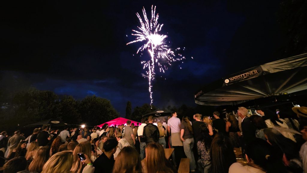 Das große beeindruckende Feuerwerk am Samstagabend um 22:40 Uhr begann mit einem lauten Kracher und endete mit starkem Applaus der Hunderten Partygäste, die sich über das bunte Feuerwerk-Spektakel am Nachthimmel freuten.