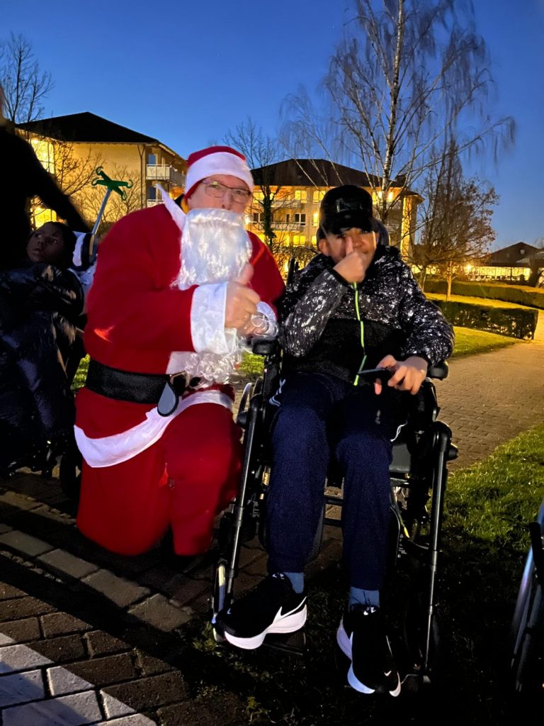 Kurz nach Einbruch der Dunkelheit startete die Staffel vom Standort in der Henrichs-Allee mit drei festlich geschmückten Einsatzmotorrädern, einem Quad und einem Begleitfahrzeug. Kurz vor der Ankunft wurde zur Freude der Kinder das Blaulicht eingeschaltet. Ein bunter, leuchtender Lindwurm zog sich somit bis zur Reha-Klinik.