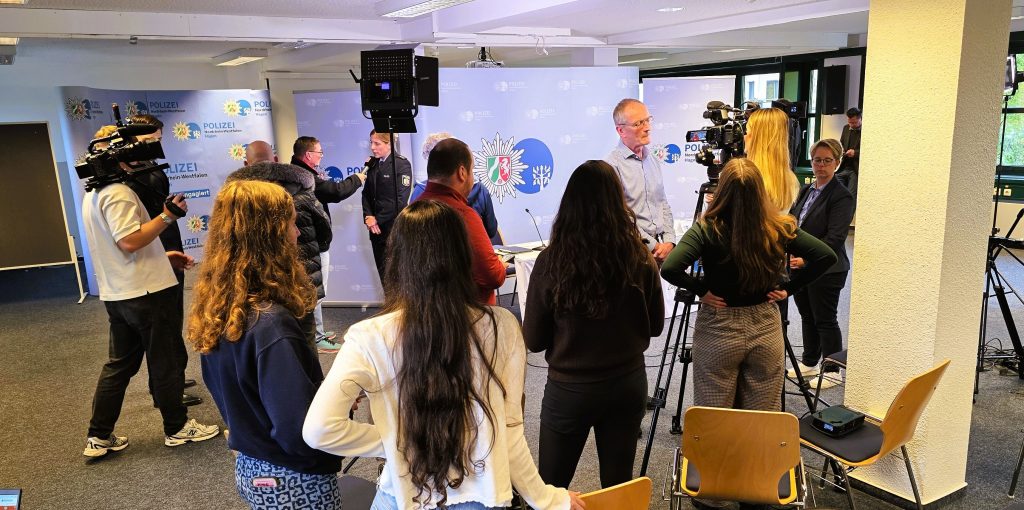 Polizei Hagen: Nach der Pressekonferenz wegen der Messerattacke hatten die Medienvertreter Gelegenheit zu Einzelinterviews. (Foto: Höffken)