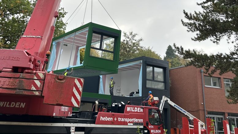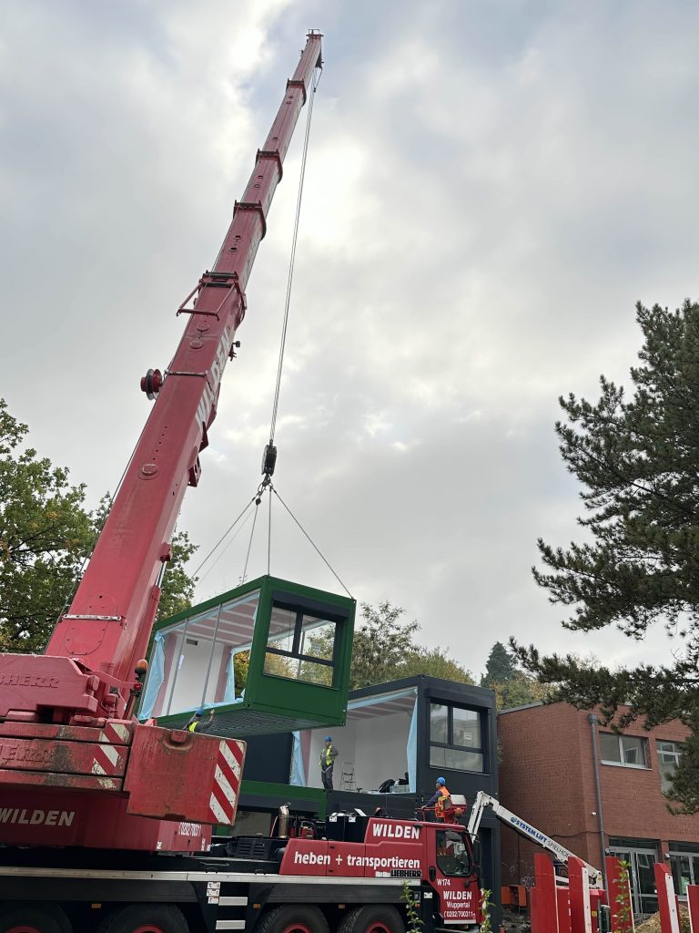 Hattingen- Sie fielen fast vom Himmel. Die neuen Klassenzimmer für die Realschule schwebten an zwei Tagen mit dem Kran auf den Schulhof an der Grünstraße. Insgesamt entstehen aktuell acht neue Klassenräume und damit doppelt so viele, wie im Sommer vergangenen Jahres abgerissen werden mussten.