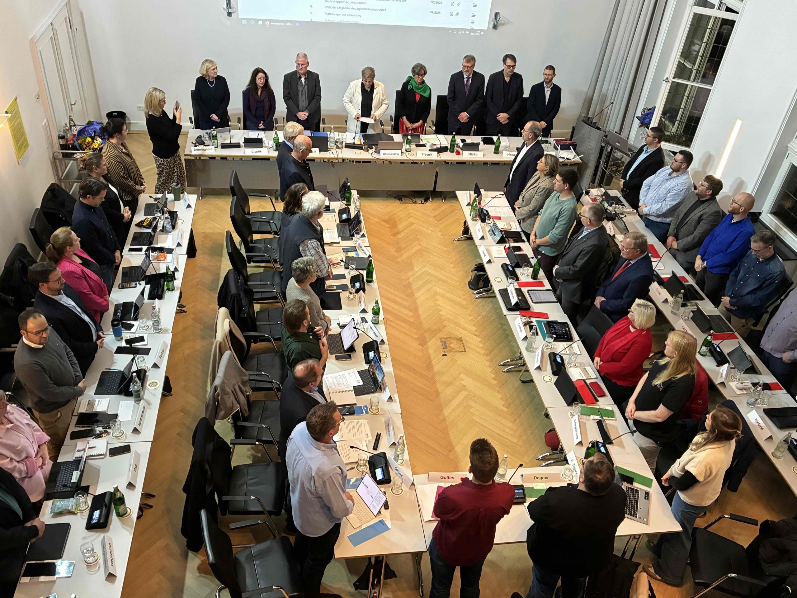 Hattingen – Mit der konstituierenden Ratssitzung am 6. November 2025 beginnt die neue Ratsperiode. Im Großen Sitzungssaal des Rathauses kamen die gewählten Politikerinnen und Politiker zum ersten Mal zusammen, darunter viele bekannte, aber auch neue Gesichter. Insgesamt wurden 54 neue Mitglieder vereidigt, die in den kommenden fünf Jahren den Rat der Stadt Hattingen bilden. Auch die neue Bürgermeisterin Melanie Witte-Lonsing wurde während der Sitzung vereidigt.