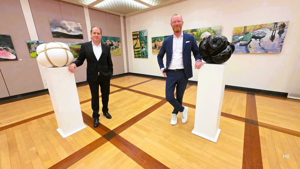 Denkanstöße – Kunst spendet: Oliver Flüshöh und Daniel Rasche an ausgestellten Skulpturen von Stephan Marienfeld im Ausstellungsraum der Sparkasse. (Foto: Höffken)