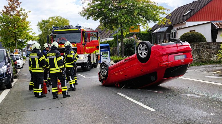 Infolge der Kollision war der Pkw Audi mitten auf der Fahrbahn auf dem Autodach liegen geblieben. Bei Eintreffen der Feuerwehr hatte sich der Fahrer bereits mit Unterstützung von Passanten aus dem Fahrzeug befreien können.