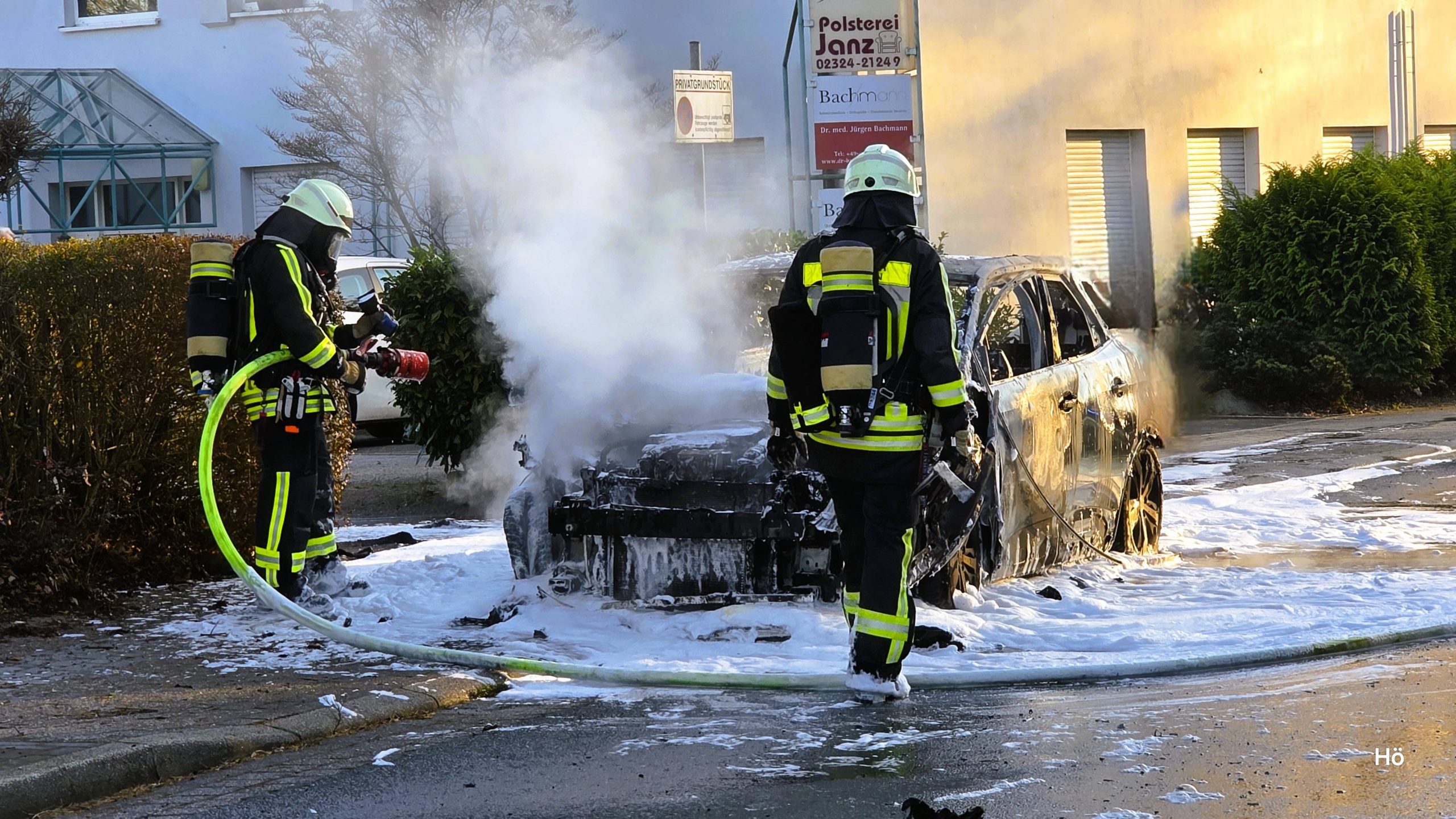 Brandeinsatz: Bei dem brennenden PKW auf der Bredenscheider Straße wurden Feuerwehr, Polizei, Bauhof und untere Wasserbehörde tätig. (Foto: Höffken)