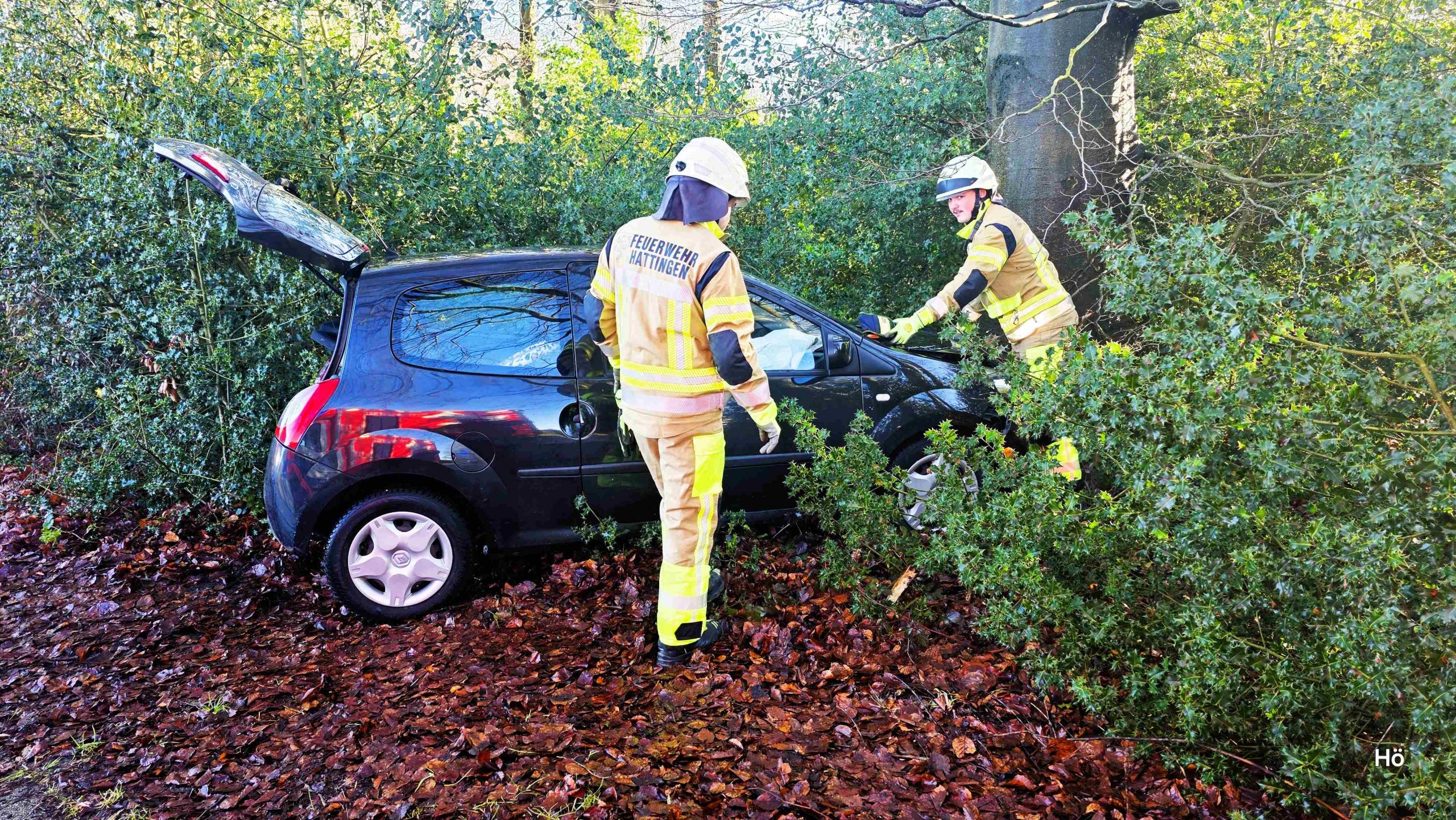Hattingen – Glück im Unglück hatten zwei Pkw-Insassen, als ihr Renault Twingo am heutigen Mittwoch ( 4. Februar 2026) gegen 9:50 Uhr auf der Stöckerstraße im Bereich einer Kurve von der Fahrbahn abkam und gegen einen Baum prallte. Bei dem Unfall wurden die beiden Pkw-Insassen weder eingeklemmt noch eingeschlossen, allerdings leicht verletzt.
