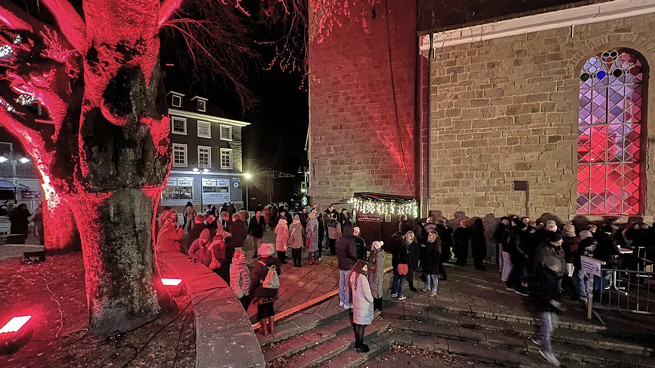Am 23. Dezember war es wieder so weit. Schon vor dem Einlass zeigte sich: Hier geht es nicht um „mal gucken“, hier kommen viele, die wissen, was sie erwartet. Ab 21:30 Uhr war draußen die Glühweinbude geöffnet – als Wärmespender für die Wartenden und später als Treffpunkt für alle, die den Gottesdienst draußen verfolgten. Denn: Erstmals wurde bei großem Andrang eine Außenübertragung eingeplant. Die Zwiebelturmkirche fasst rund 500 Personen – und die Plätze waren bis auf den letzten Zentimeter belegt.