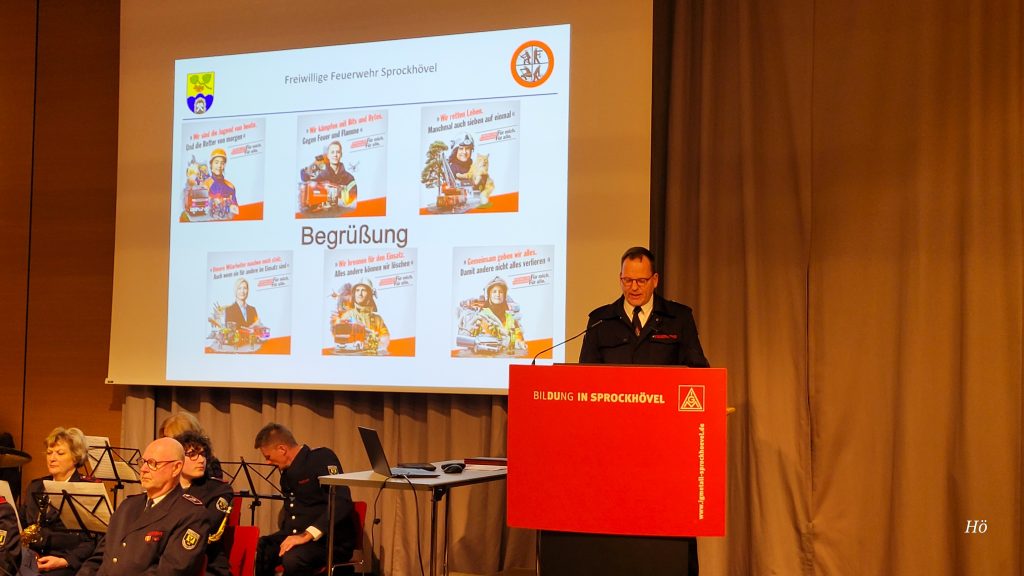 Der Präsident des Kreisfeuerwehrverbandes, Markus Neuhaus, ging auf die heutigen globalen Krisen ein. Deren Folgen seien auch im Ennepe-Ruhr-Kreis aber auch in der Stadt Sprockhövel von Relevanz. Die nun auf Ebene des Bundes beschlossenen Sondervermögen müsse man auch dazu nutzen, den Zivil- und Katastrophenschutz zu stärken und effektiver zu gestalten. Der Verband der Feuerwehren in NRW habe dazu auch ein Positionspapier veröffentlicht, ergänzte Neuhaus zum Schluss seiner Begrüßungsrede.