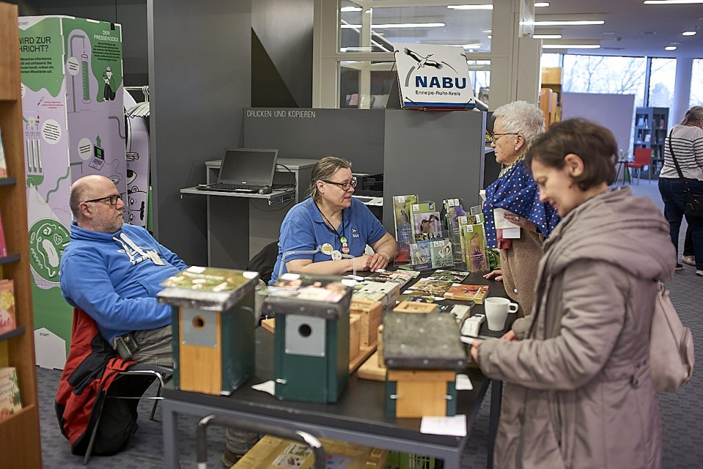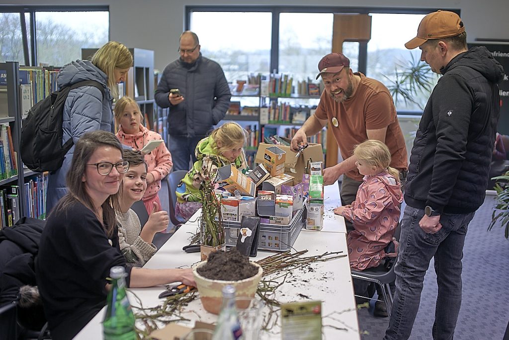 Rund um die Saatgutbibliothek hatten sich am Samstag mehrere Gruppen und Initiativen in der Stadtbibliothek versammelt. Mit dabei waren der NABU, der Gemeinschaftsgarten Kunterbunt, Martin Maschka von der Wildnisschule mit einem Bastelangebot für Kinder sowie die städtischen Gärtnerinnen, die über Baumscheibenpatenschaften informierten. Für Kaffee und Waffeln sorgte der ehemalige Freundeskreis.