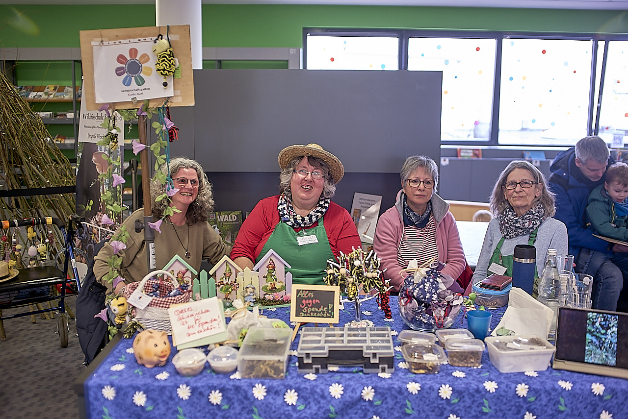Rund um die Saatgutbibliothek hatten sich am Samstag mehrere Gruppen und Initiativen in der Stadtbibliothek versammelt. Mit dabei waren der NABU, der Gemeinschaftsgarten Kunterbunt, Martin Maschka von der Wildnisschule mit einem Bastelangebot für Kinder sowie die städtischen Gärtnerinnen, die über Baumscheibenpatenschaften informierten. Für Kaffee und Waffeln sorgte der ehemalige Freundeskreis.