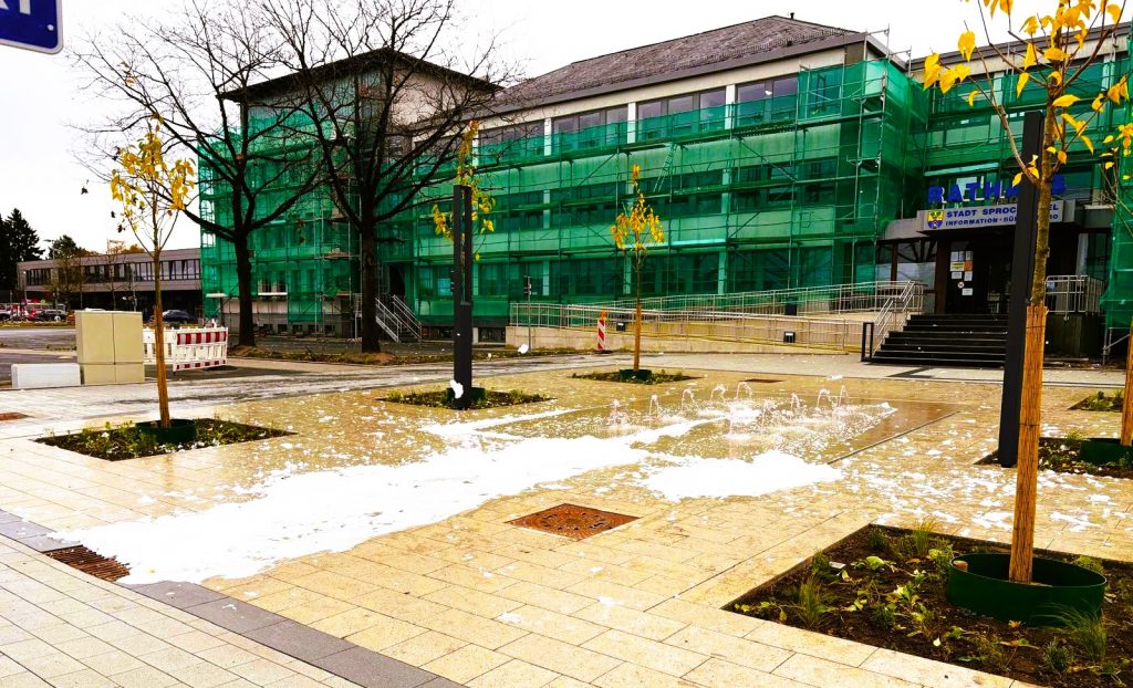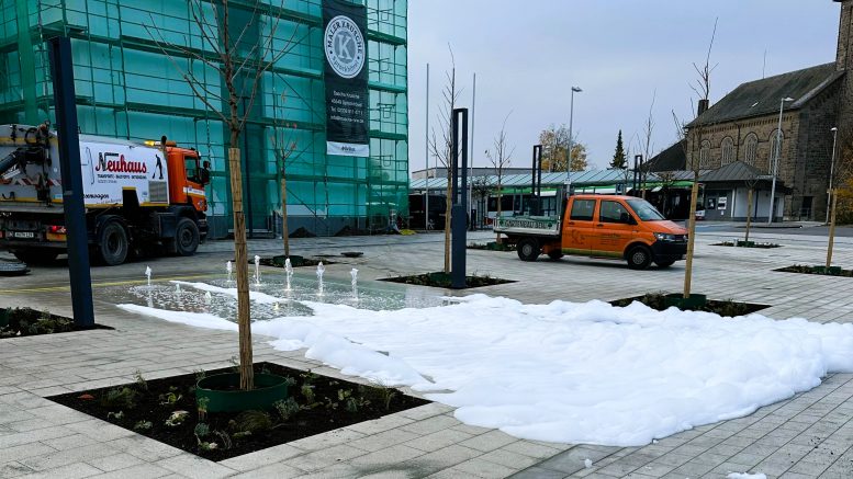 Sprockhövel – Die Verärgerung ist groß und eine Strafanzeige wurde erstattet. Nachdem die Neugestaltung des Rathausvorplatzes kurz vor der Vollendung steht, die Flächen neu gestaltet, die Bäume gepflanzt sind und die Brunnenanlage im Testbetrieb läuft, haben Unbekannte zum zweiten Mal große Mengen Schaummittel in die Brunnentechnik geschüttet.