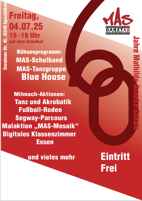 Sprockhövel – Die überregional bekannte Mathilde-Anneke-Schule (MAS) feiert am Freitag, 04. Juli 2025, ihr 60. Schuljubiläum und lädt dazu ganz herzlich ein.