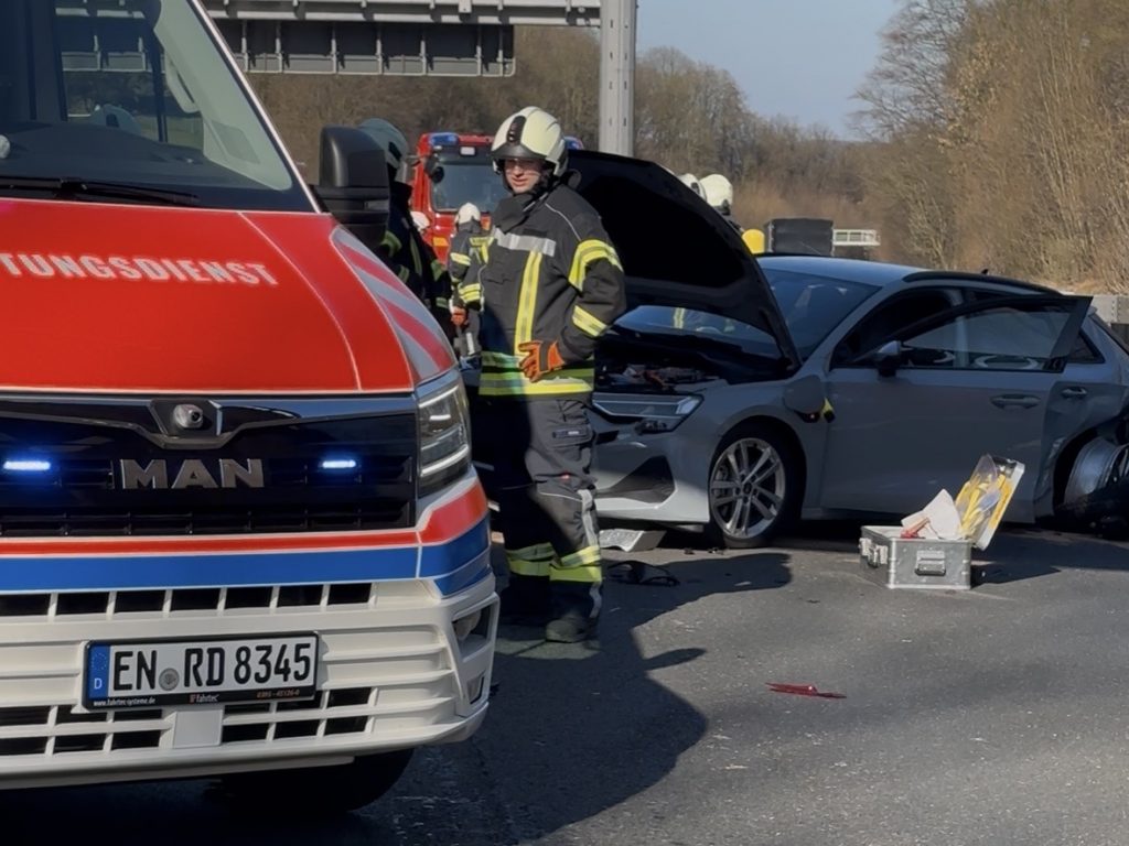 Sprockhövel – Am heutigen Dienstagnachmittag (3. März2026) ereignete sich auf der A 43 in Fahrtrichtung Wuppertal kurz vor dem Autobahnkreuz gegen 13:30 Uhr ein schwerer Verkehrsunfall mit drei Fahrzeugen. Dem Notruf nach waren möglicherweise mehrere Personen in den Unfallfahrzeugen eingeklemmt.