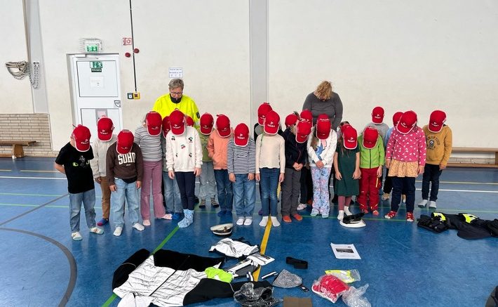 Zunächst wurde gezeigt, wie retroreflektierende Materialien im Straßenverkehr wirken und warum es so wichtig ist, gerade in der dunklen Jahreszeit gut sichtbar zu sein. Anschließend bekamen die Kinder eine leuchtend rote, reflektierende Kappe, die von der Kreisverkehrswacht gespendet wurde. Im Anschluss machten sich alle gemeinsam auf den Weg zur Kirche in Herzkamp. Dabei gingen sie den vorgesehenen Schulweg zu Fuß ab und übten ganz praktisch, wie man sicher Straßen überquert und mögliche Gefahrenstellen erkennt.