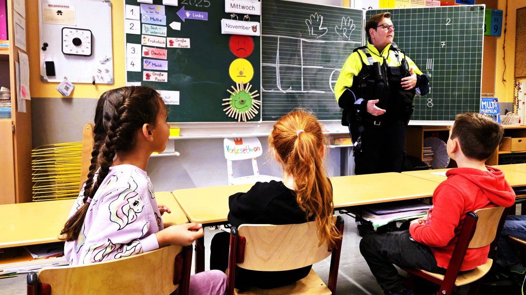 Sprockhövel – In der Klasse 1 der Grundschule Gennebreck war heute die Polizei zu Besuch. Polizeihauptkommissarin Sonja Vatheuer erklärte den Schulanfängern, wie wichtig es ist, dass man deutlich gesehen wird, wenn man als Kind unterwegs ist.