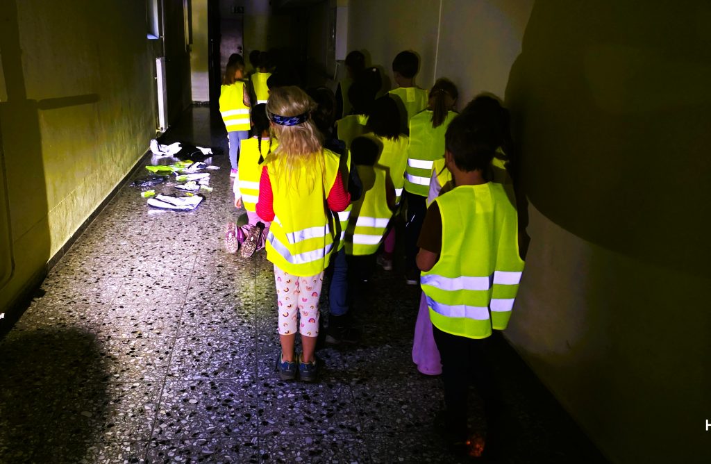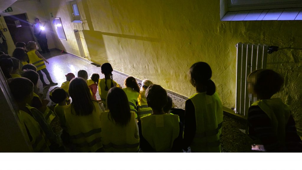 In Zweierreihen ging es dann diszipliniert in das Untergeschoss, wo die Bezirksbeamtin den Kindern dann in einem verdunkelten Flur verdeutlichte, wie gut man gesehen wird, wenn man entsprechend reflektierend gekleidet und wie schlecht man gesehen wird, wenn man dunkle nicht reflektierende Kleidung trägt.