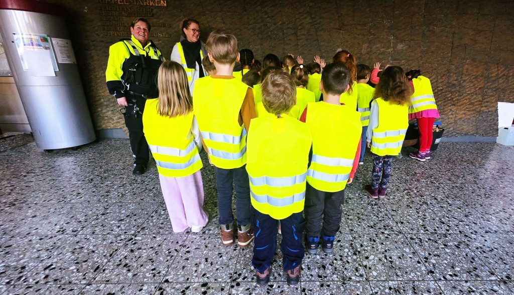 Natürlich hatten sowohl die Klassenlehrerin, die Bezirksbeamtin und auch der Reporter bemerkt, dass einige Kinder blinkende Sohlen an ihren Schuhen hatten. Nach einem rhythmischen „Stoppstein-Lied“, gesungen, geklatscht und gestampft ging es dann zum Abschlussfoto in den Eingangsbereich.
