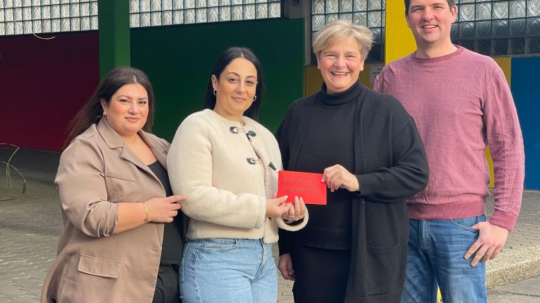 Hattingen- Spendenübergabe an der Grundschule Heggerfeld. Die Vorsitzende der SPD im Hattinger Stadtrat, Melanie Witte-Lonsing, und ihr Stellvertreter Michael Kreutz sind gekommen, um einen roten Umschlag zu überreichen. Der Inhalt: Eine Geldspende von gut 300€.